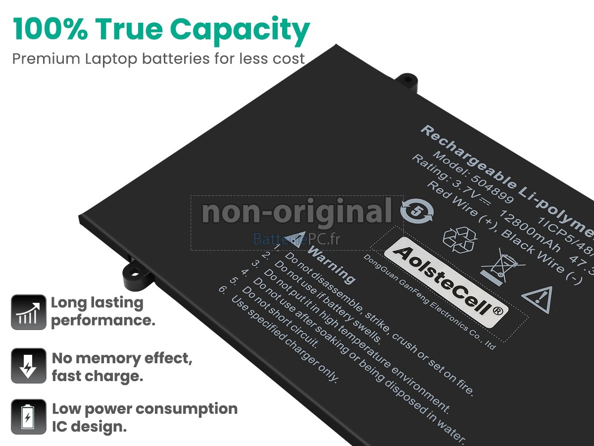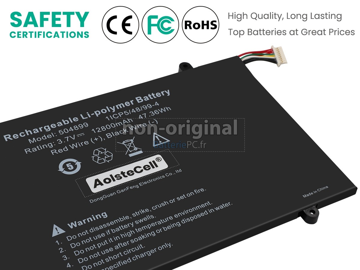 Nous utilisons la puce de Texas (USA) intelligente, pour vous assurer que la batterie se charge plus rapidement, et que la précision de la détection de la température, de la tension et du courant est plus fiable; le boîtier de la batterie conçue est identique à celle d'origine, 100% compatible avec votre ordinateur portable, pour que notre batterie ordinateur portable AolsteCell 504899 est compatible complètement avec votre ordinateur portable, et que vous seriez plus rassuré lors de l'utilisation de ces batteries.