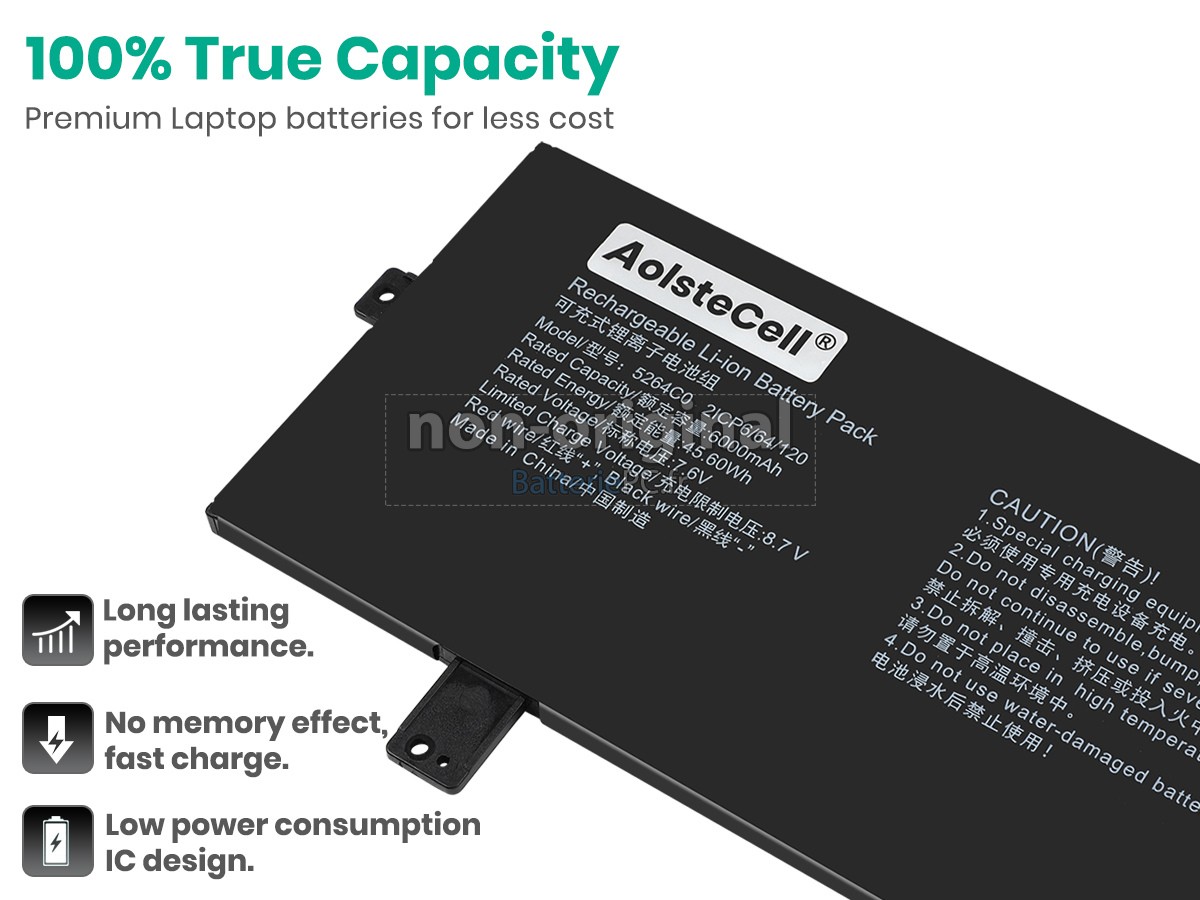 Nous utilisons la puce de Texas (USA) intelligente, pour vous assurer que la batterie se charge plus rapidement, et que la précision de la détection de la température, de la tension et du courant est plus fiable; le boîtier de la batterie conçue est identique à celle d'origine, 100% compatible avec votre ordinateur portable, pour que notre batterie ordinateur portable AolsteCell 5264C0 est compatible complètement avec votre ordinateur portable, et que vous seriez plus rassuré lors de l'utilisation de ces batteries.