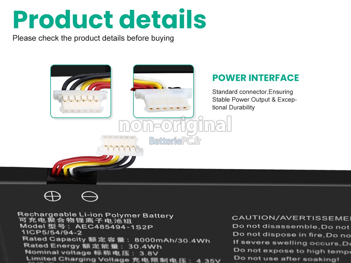 Nous utilisons la puce de Texas (USA) intelligente, pour vous assurer que la batterie se charge plus rapidement, et que la précision de la détection de la température, de la tension et du courant est plus fiable; le boîtier de la batterie conçue est identique à celle d'origine, 100% compatible avec votre ordinateur portable, pour que notre batterie ordinateur portable AolsteCell AEC485494-1S2P est compatible complètement avec votre ordinateur portable, et que vous seriez plus rassuré lors de l'utilisation de ces batteries.