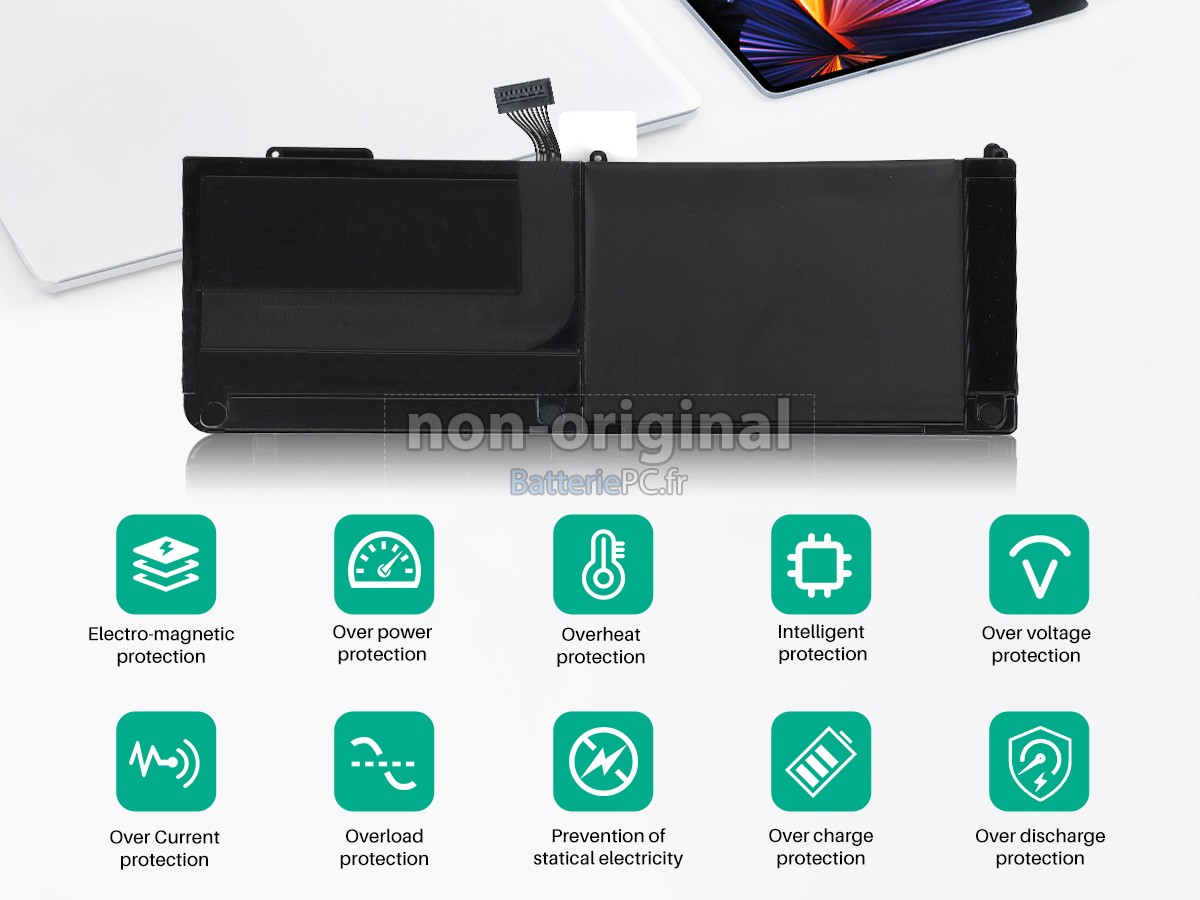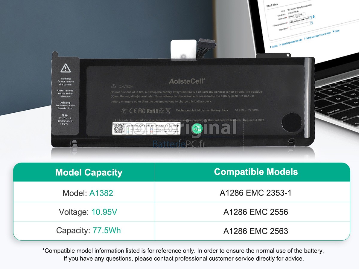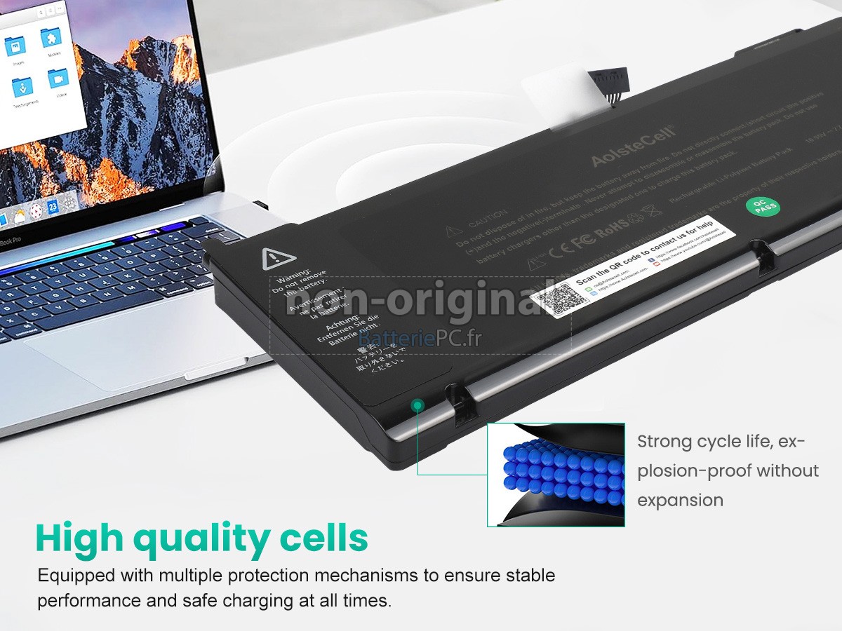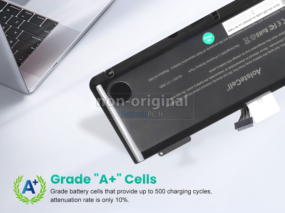 Nous utilisons la puce de Texas (USA) intelligente, pour vous assurer que la batterie se charge plus rapidement, et que la précision de la détection de la température, de la tension et du courant est plus fiable; le boîtier de la batterie conçue est identique à celle d'origine, 100% compatible avec votre ordinateur portable, pour que notre batterie ordinateur portable Apple A1382 est compatible complètement avec votre ordinateur portable, et que vous seriez plus rassuré lors de l'utilisation de ces batteries.
