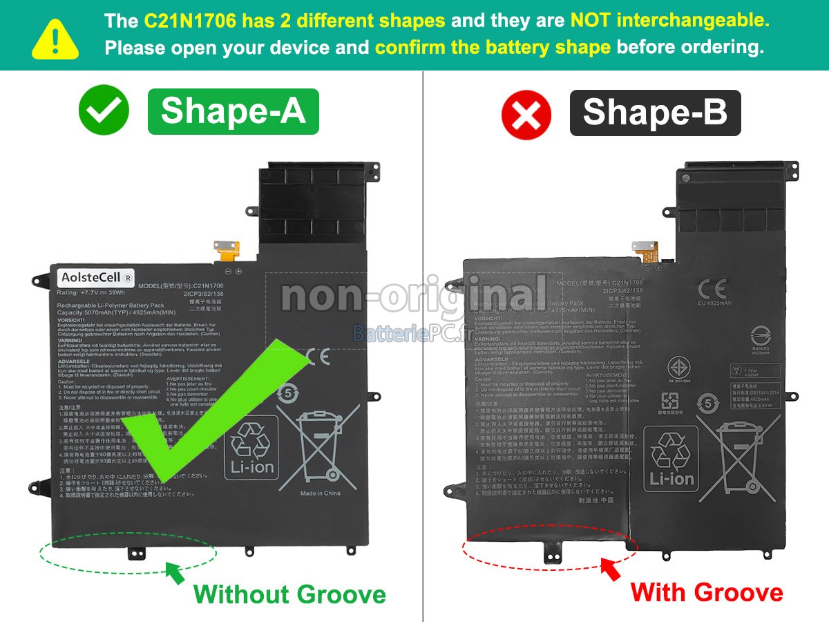 Nous sommes heureux de vous fournir des produits de bonne qualité et des services excellents, pour vous rendre plus rassuré lorsque vous achetez la batterie ordinateur portable Asus C21N1706. Nous vous proposons de bien noter les consignes ci-dessous pour profiter de nos meilleurs services.- Merci d'indiquer le modèle de votre appareil pour que notre service client puisse voir si vous avez acheté la bonne batterie, afin d'éviter l'achat de batterie non adaptée.