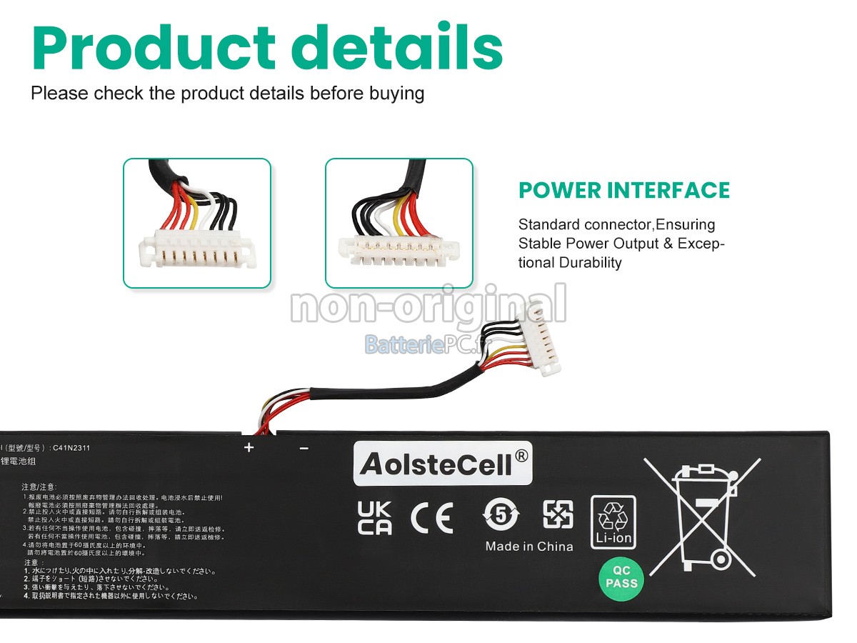 Nous utilisons la puce de Texas (USA) intelligente, pour vous assurer que la batterie se charge plus rapidement, et que la précision de la détection de la température, de la tension et du courant est plus fiable; le boîtier de la batterie conçue est identique à celle d'origine, 100% compatible avec votre ordinateur portable, pour que notre batterie ordinateur portable Asus C41N2311 est compatible complètement avec votre ordinateur portable, et que vous seriez plus rassuré lors de l'utilisation de ces batteries.