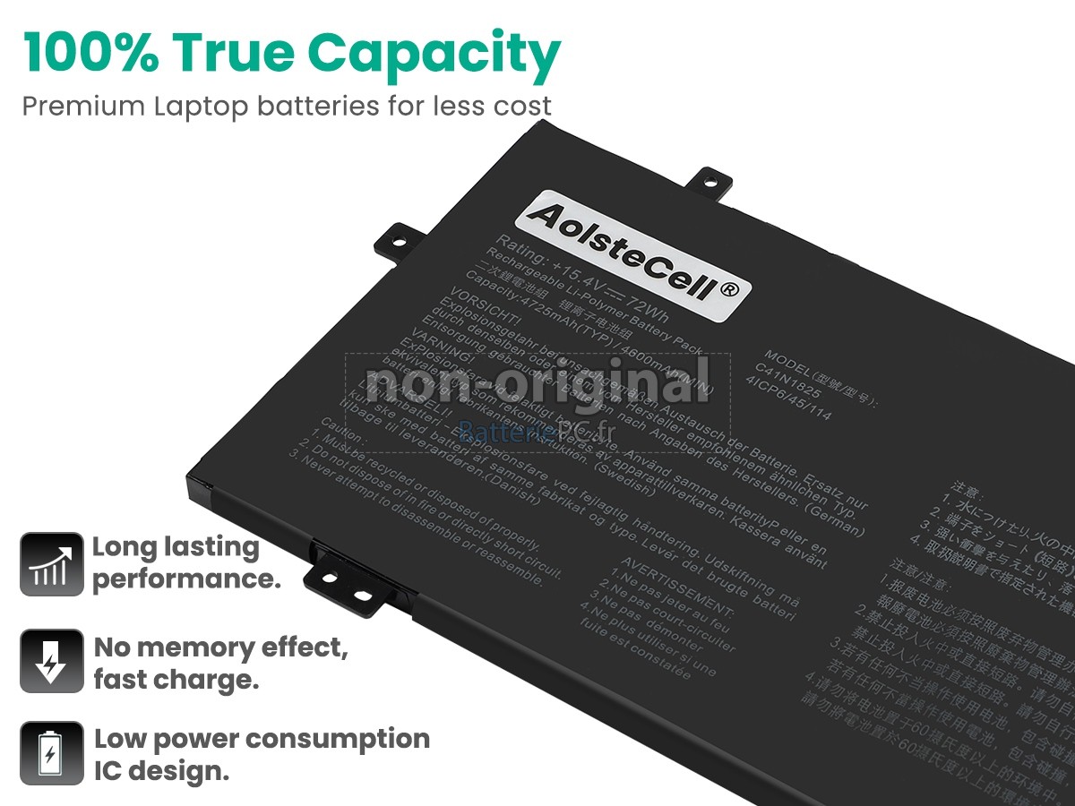 Nous utilisons la puce de Texas (USA) intelligente, pour vous assurer que la batterie se charge plus rapidement, et que la précision de la détection de la température, de la tension et du courant est plus fiable; le boîtier de la batterie conçue est identique à celle d'origine, 100% compatible avec votre ordinateur portable, pour que notre batterie ordinateur portable Asus VivoBook 14 X403FA est compatible complètement avec votre ordinateur portable, et que vous seriez plus rassuré lors de l'utilisation de ces batteries.