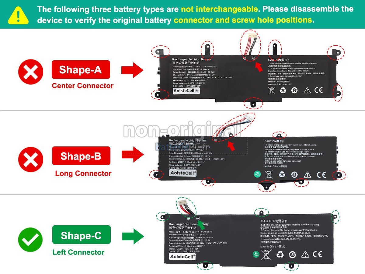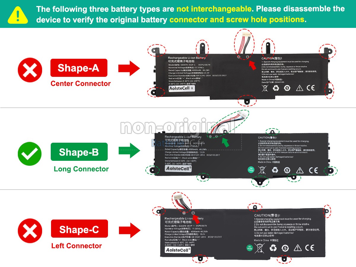 Nos batterie pour CHUWI 505979-3S1P-1(3ICP5/59/79) notebook pc, comme celles d'ordinateurs de marque, sont montées avec les cellules de la qualité A+ et les puces intelligentes de qualité supérieure. Mais nous personnalisons notre propre boîtier de batterie et réduisons le coût supplémentaire requis par la marque, c'est pourquoi les clients peuvent acheter des batteries de remplacement de qualité d'origine au prix compétitif.