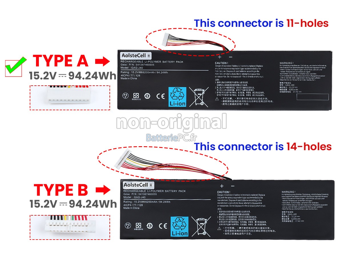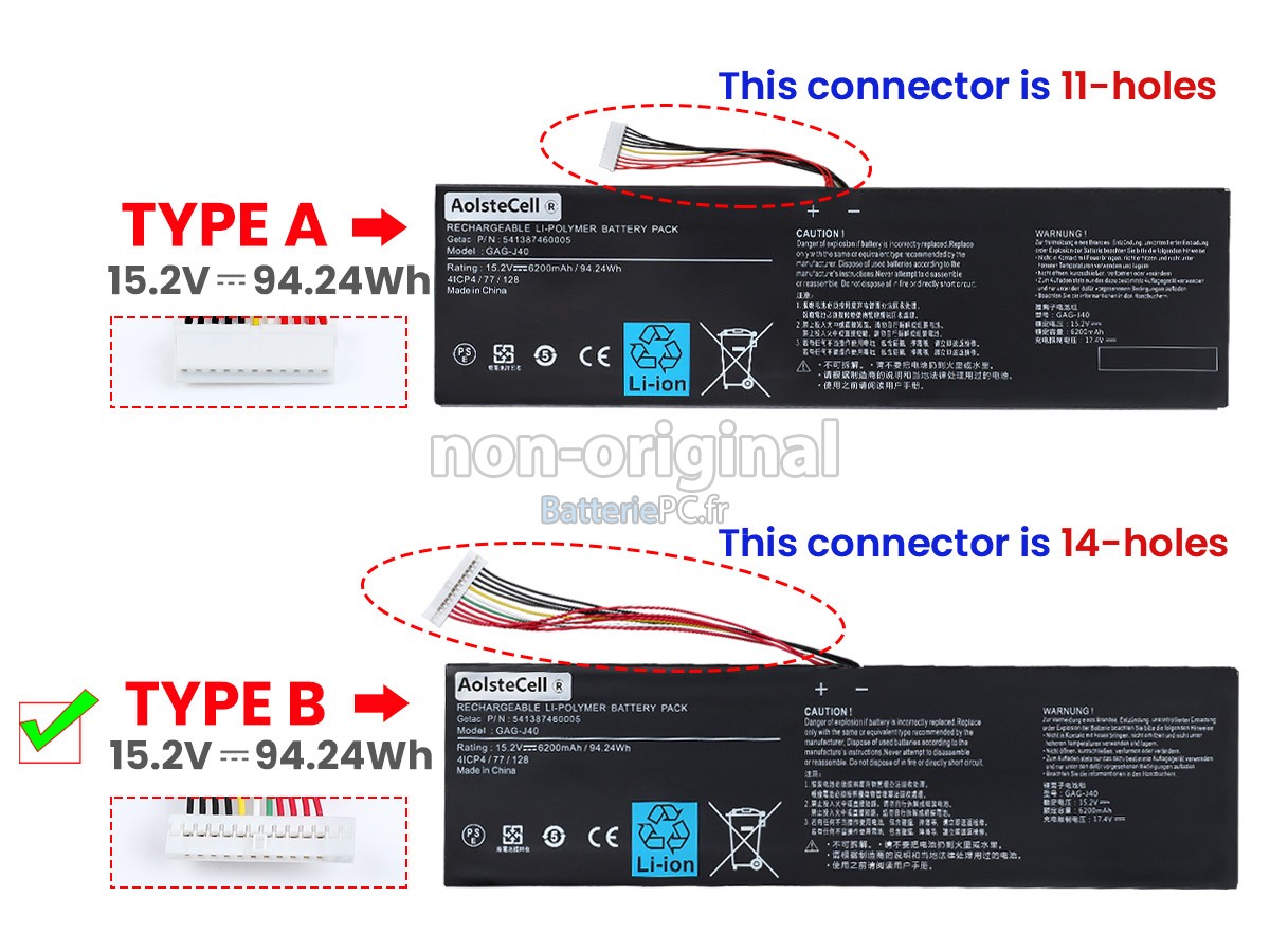 Nous sommes heureux de vous fournir des produits de bonne qualité et des services excellents, pour vous rendre plus rassuré lorsque vous achetez la batterie ordinateur portable Gigabyte AORUS X5 V8. Nous vous proposons de bien noter les consignes ci-dessous pour profiter de nos meilleurs services.- Merci d'indiquer le modèle de votre appareil pour que notre service client puisse voir si vous avez acheté la bonne batterie, afin d'éviter l'achat de batterie non adaptée.
