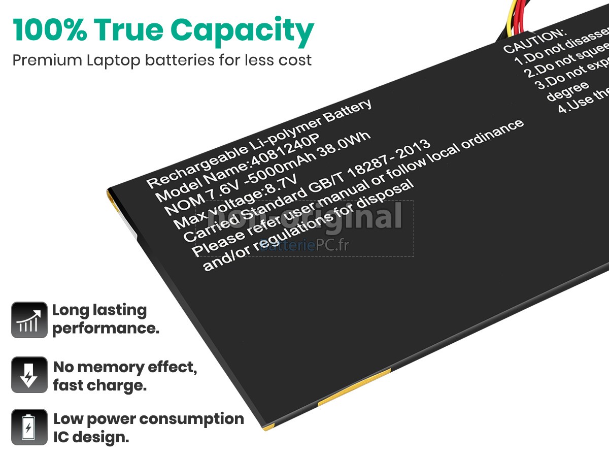 Il n'y a pas d'autre différence, sauf que notre batterie n'a pas d'étiquette de marque.Les clients pensent toujours que la technique professionnelle des fabricants d'ordinateurs de marque détermine les hautes performances des batteries d'origine telles que HP, Dell, Toshiba, etc. En fait, pour ces ordinateurs de marque, dont les batteries sont fabriquées avec les pièces du tiers (par exemple : Samsung et TI), comme tout le monde le sait, les processeurs d'ordinateurs portables ne sont pas développés par les fabricants d'ordinateurs de marque.