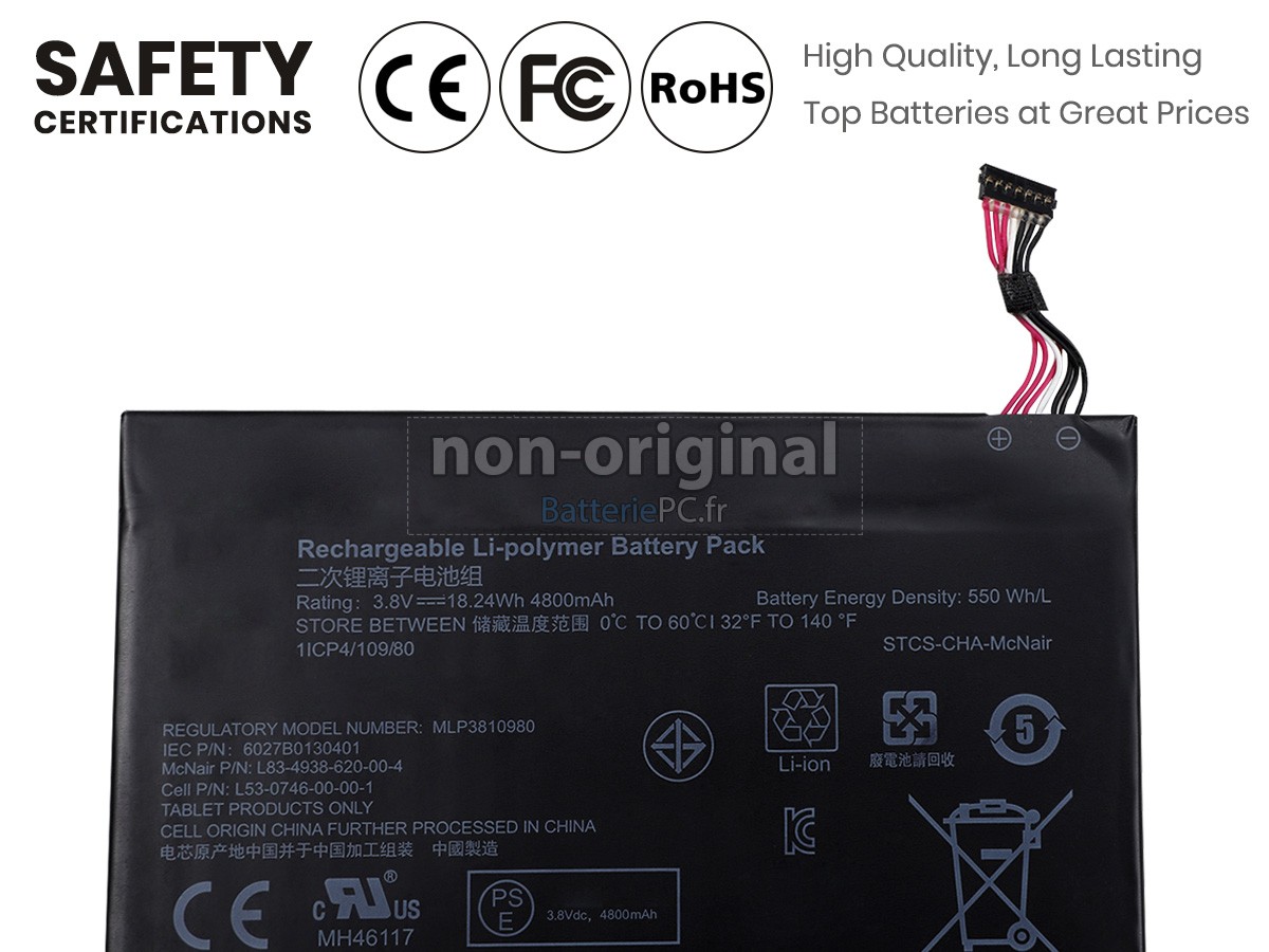 Les batteries vendues sur BatteriePC.fr sont des produits de remplacement de haute qualité. Les logos et les marques concernées appartiennent au registraire d'origine. Les marques et les modèles mentionnés ici par nous sont uniquement pour vous montrer la compatibilité des produits, afin que les clients puissent acheter correctement les produits dont ils ont besoin. En cas d'insatisfaction sur nos produits, veuillez nous contacter en ligne ou nous écrire via e-mail. Nous vous répondrons dans les 24 heures. Notre objectif est de rendre le client satisfait à 100%.