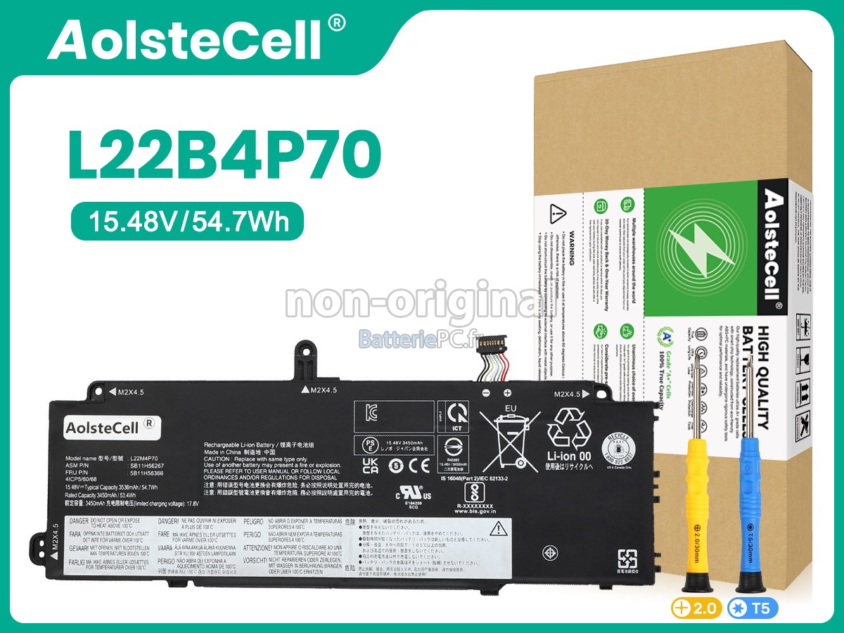 Nous utilisons la puce de Texas (USA) intelligente, pour vous assurer que la batterie se charge plus rapidement, et que la précision de la détection de la température, de la tension et du courant est plus fiable; le boîtier de la batterie conçue est identique à celle d'origine, 100% compatible avec votre ordinateur portable, pour que notre batterie ordinateur portable Lenovo L22D4P70 est compatible complètement avec votre ordinateur portable, et que vous seriez plus rassuré lors de l'utilisation de ces batteries.