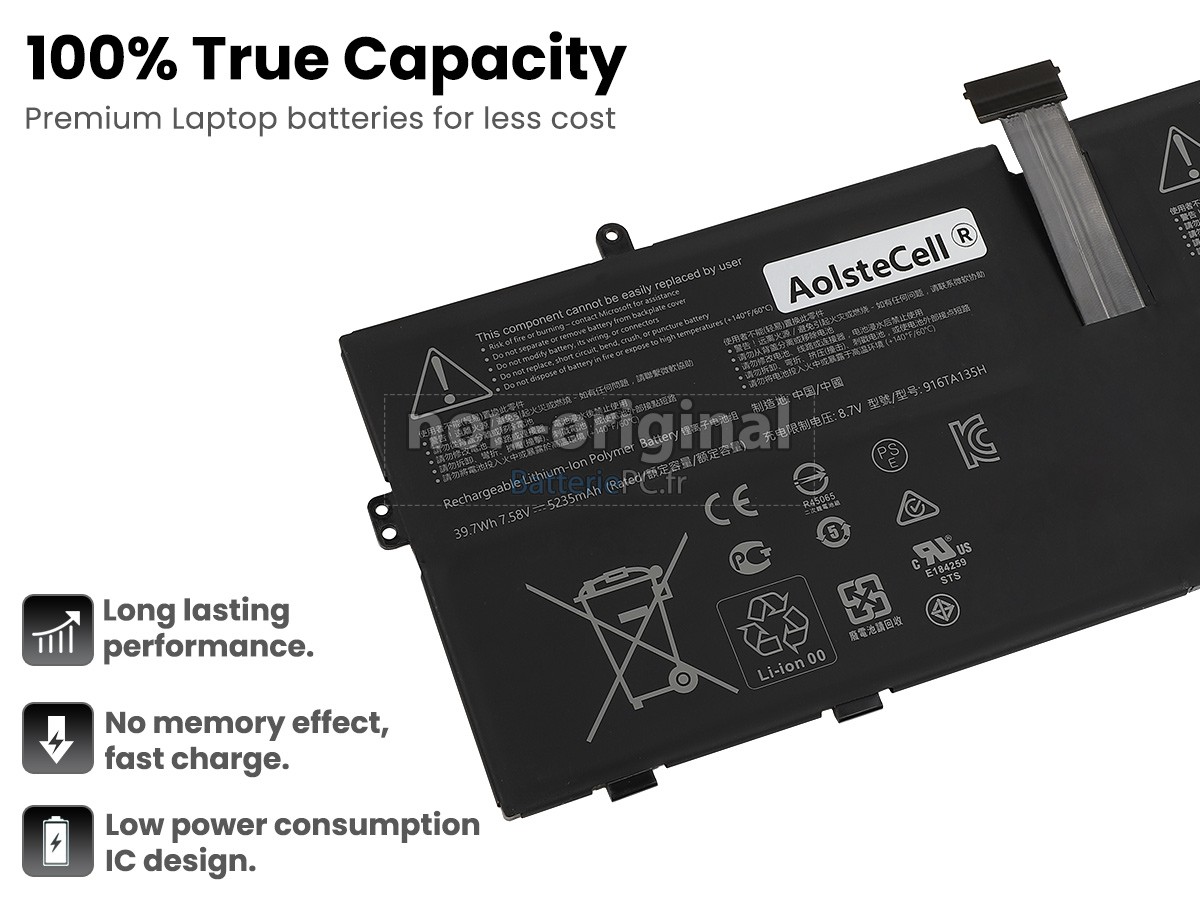 Nous utilisons la puce de Texas (USA) intelligente, pour vous assurer que la batterie se charge plus rapidement, et que la précision de la détection de la température, de la tension et du courant est plus fiable; le boîtier de la batterie conçue est identique à celle d'origine, 100% compatible avec votre ordinateur portable, pour que notre batterie ordinateur portable Microsoft 916TA135H est compatible complètement avec votre ordinateur portable, et que vous seriez plus rassuré lors de l'utilisation de ces batteries.