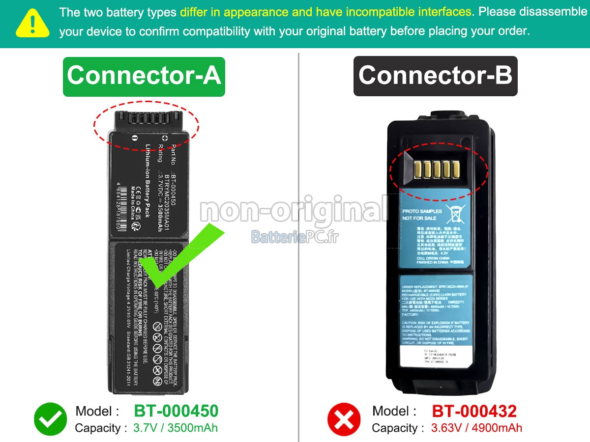 Nous sommes heureux de vous fournir des produits de bonne qualité et des services excellents, pour vous rendre plus rassuré lorsque vous achetez la batterie Zebra MC2700. Nous vous proposons de bien noter les consignes ci-dessous pour profiter de nos meilleurs services.- Merci d'indiquer le modèle de votre appareil pour que notre service client puisse voir si vous avez acheté la bonne batterie, afin d'éviter l'achat de batterie non adaptée.