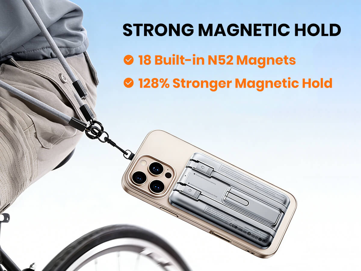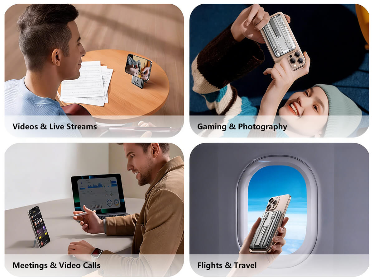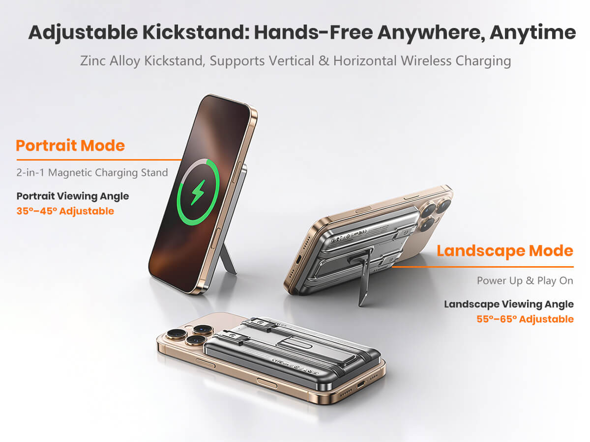 Le support pliable intégré permet de positionner votre smartphone en mode portrait ou paysage pendant la recharge. Associé à la fixation magnétique, il maintient votre appareil en place de manière stable, idéal pour regarder des vidéos, passer des appels vidéo ou naviguer.