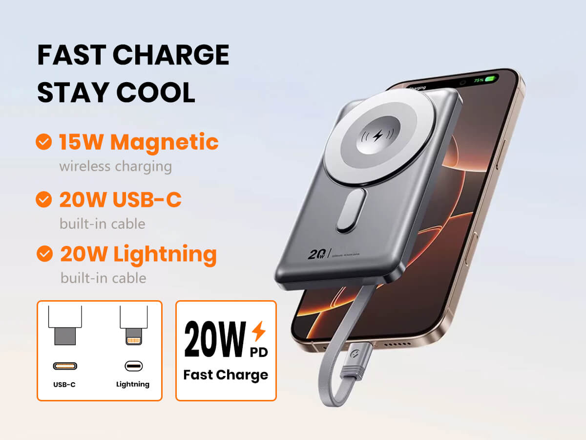 Conçue pour un maximum de praticité, cette batterie externe permet de recharger jusqu’à 4 appareils simultanément. Elle intègre une recharge sans fil magnétique 15 W, des câbles USB-C et Lightning intégrés (jusqu’à 20 W en sortie), ainsi qu’un port USB-C supplémentaire (entrée/sortie, jusqu’à 18 W en entrée).