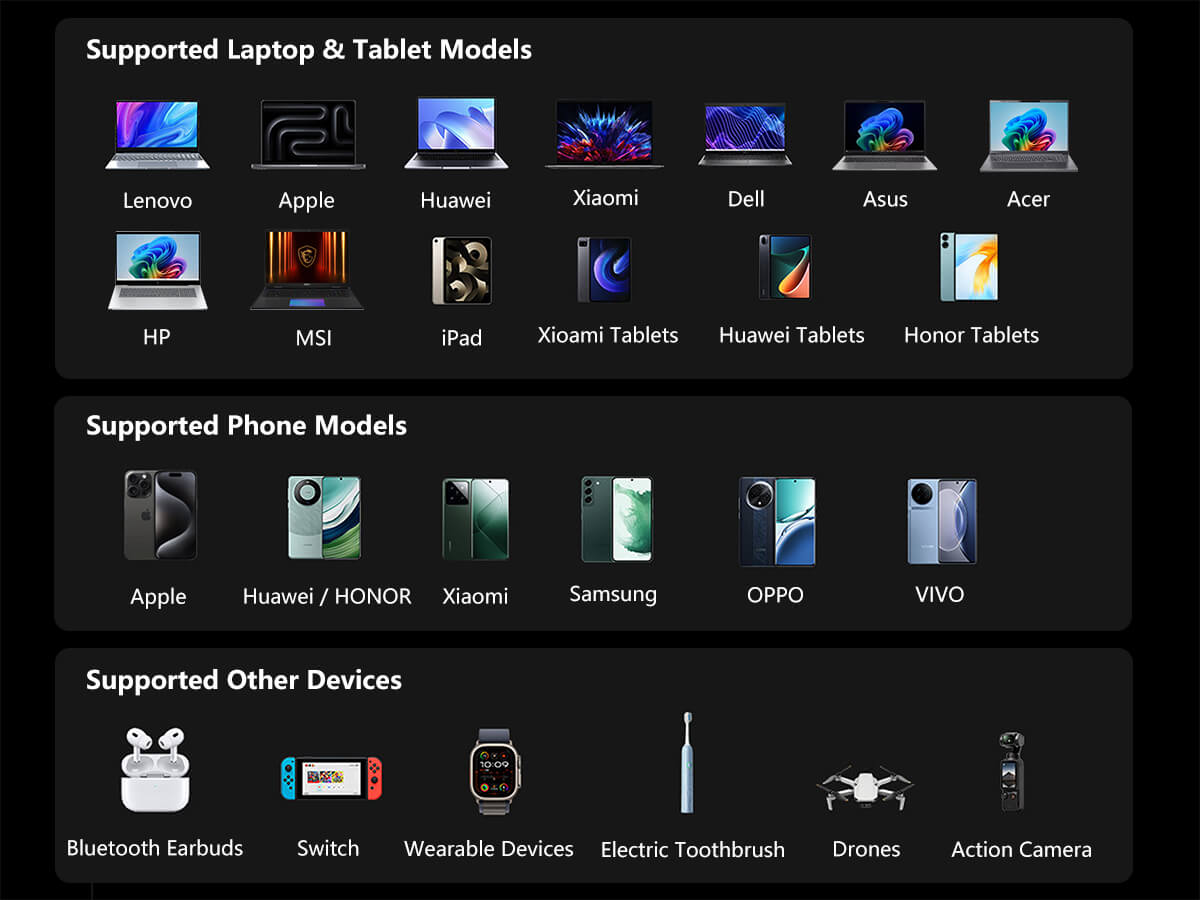 - Retractable Cable Input/Output (60W/100W) 20V3A; 20V5A